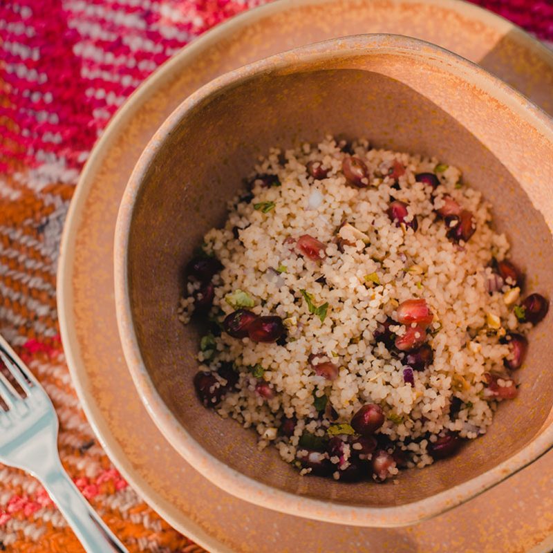 Este básico versátil del norte de África se suele servir de forma sencilla, con semillas de granada añadiendo toques agridulces y pistachos verdes sin tostar dando a la experiencia un aroma fresco a nuez.
