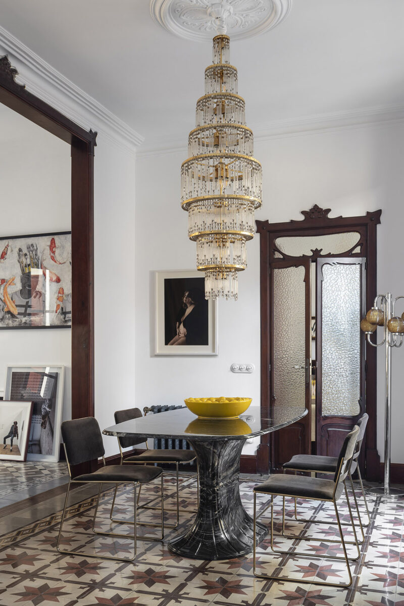 “Tuvimos mucha suerte con nuestros clientes, con los que conectamos desde el principio”, explica Diana Huete, diseñadora jefe de Bondian Living. Eran una pareja vienesa enamorada del arte y las antigüedades, y esto desempeñaría un papel importante en la visión final. Sin embargo, primero había que abrir el espacio, ya que se trataba de una residencia típica de principios de siglo, un laberinto de rincones y habitaciones pequeñas. El mayor reto era conseguir una distribución más abierta, manteniendo las características y elementos patrimoniales del edificio.