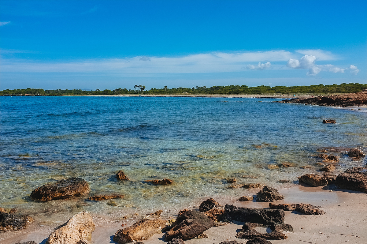 La playa más al sur de Mallorca se encuentra entre la Colónia Sant Jordi y El Faro de Ses Salines. Es un largo tramo desierto de fina arena blanca y en un día tranquilo, el agua es de un fascinante color turquesa. Si sales desde el faro de Ses Salines la playa se encuentra a un paseo de 2 km por un sendero llano o por las fascinantes rocas de color anaranjado. Alternativamente, también puedes salir desde Colónia Sant Jordi, con un paseo de 6km que pasa por las playas de Es Dolç, Carbó y Ses Roquetes. El color del agua, las rocas, la vegetación y los islotes te harán tener tu cámara a mano incluso mucho antes de llegar a este remoto paraíso.