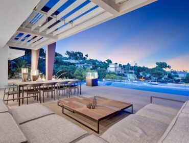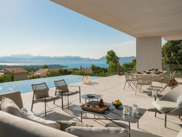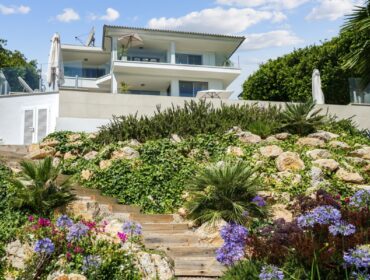 Esta excepcional villa en Portals Nous ofrece vistas panorámicas al mar, lujosos interiores y un sereno jardín mediterráneo.