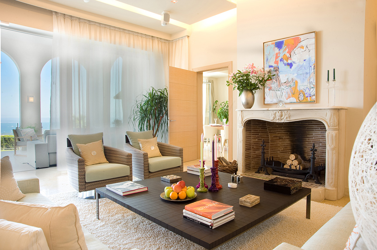 La inspiración llegó de varios fuentes. Durante un viaje en Miami, la pareja fotografió unas estanterias que les habían gustado. Artesanos mallorquines se encargaron de construir las estanterias que ahora adornan el salón basándose en las fotos. Las puertas de esta gran habitación también son artesanas, y reemplazaron a las originales del constructor.