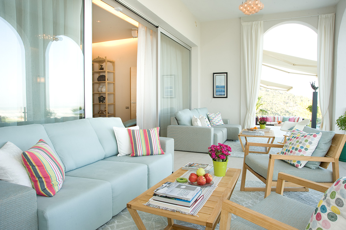 Las zonas exteriores de la casa fueron las últimas en ser tratadas y la empresaria solicitó ayuda de la interiorista Justine Knox (www.knoxdesign.net) para encontrar muebles de exterior, butacas, alfombras y un sofá modular para la terraza cubierta. “Mi cliente había visto un sofá en una revista y quería algo similar”, dice Justine. “Encontramos un arreglo modular de uno de nuestros fabricantes españoles, Confort 2000, y pudimos probar el modelo Naron en la sala de exposición. ”