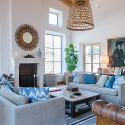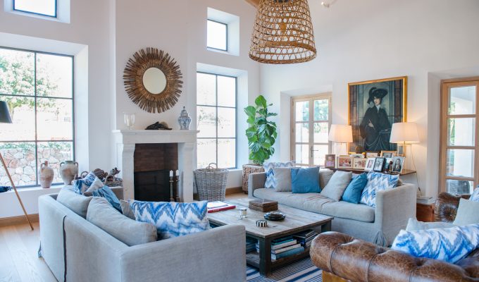 Para asegurarse de que cada casa tiene su propia personalidad, Paula elige telas y muebles hechos a medida, algunos de los cuales adquiere en Blue Bird, su tienda de diseño de interiores. Le encanta reutilizar materiales, algo que aprendió de su madre. Señala las sillas que mandó tapizar utilizando un tejido artesano mallorquín, así como las baldosas del suelo, rescatadas de otra casa. Solamente elige materiales de la mejor calidad. Los armarios hechos a medida de la espaciosa cocina son de roble y están coronados por un maravilloso mármol blanco. Todos los baños son blancos y cuentan con lavabos y azulejos muy característicos. Las pantallas y cestas de mimbre, los boles de madera y las amplias mesas bajas forman un conjunto que transmite el encanto de lo rural.
