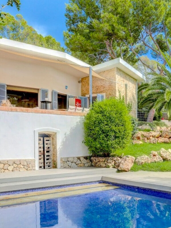 Preciosa villa de 3 dormitorios con vistas al mar en venta en Costa d’en Blanes con apartamento de invitados y piscina con vistas a la montaña y al mar.