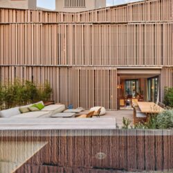 Dos fachadas diferentes forman el dinámico armazón del edificio. Más de 350 lamas verticales correderas de madera son un guiño contemporáneo a las contraventanas tradicionales mallorquinas, filtran el sol y modulan la luz y la sombra en las zonas de estar que dan al Paseo. “Son muy flexibles, permeables y adaptables”, describe Paloma. Una fachada de piedra más sólida y con textura protege las habitaciones más privadas del zumbido exterior, creando así una mayor sensación de intimidad. Esto, combinado con la ventilación cruzada y un sistema de recuperación de calor, garantiza la máxima eficiencia energética.