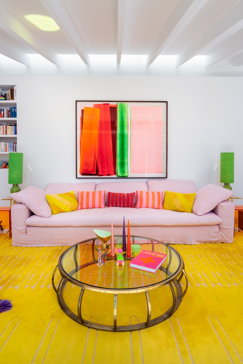 sombrillas de inspiración retro de HK Living en rosa y amarillo evocan el encanto lúdico de los años 70, mientras que las tumbonas Lobster Day, tapizadas con tejidos exclusivos, aportan un estilo desenfadado a la terraza. Estas elecciones muestran un espíritu creativo audaz que da vida a la casa.