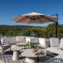 La terraza también cuenta con un lujoso jacuzzi y tumbonas para el máximo esparcimiento. Con una exuberante vegetación que envuelve el espacio, este oasis en la azotea es el lugar perfecto para tomar el sol, tomar cócteles o disfrutar de las impresionantes vistas del paisaje mediterráneo. Ya sea disfrutando de una tranquila mañana o celebrando animadas reuniones, esta terraza encarna la esencia de la vida de lujo mallorquina.