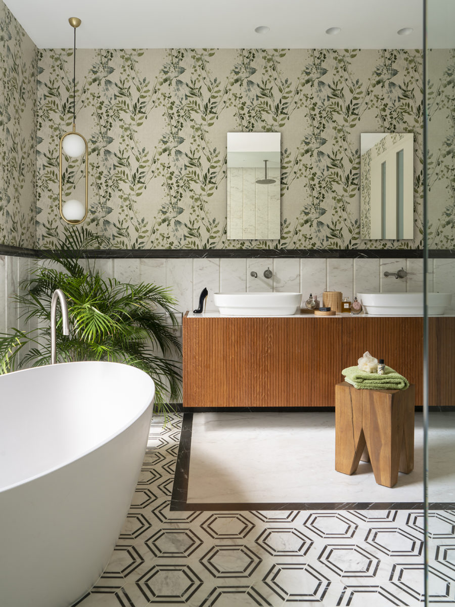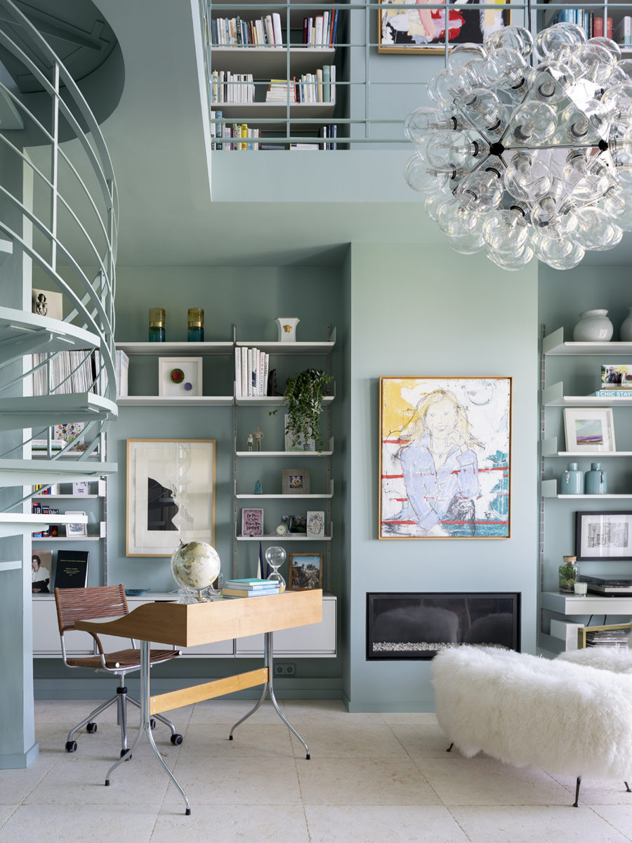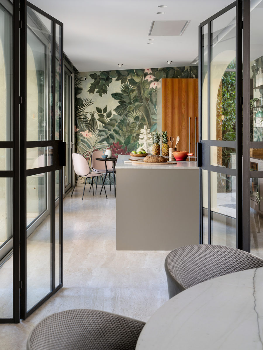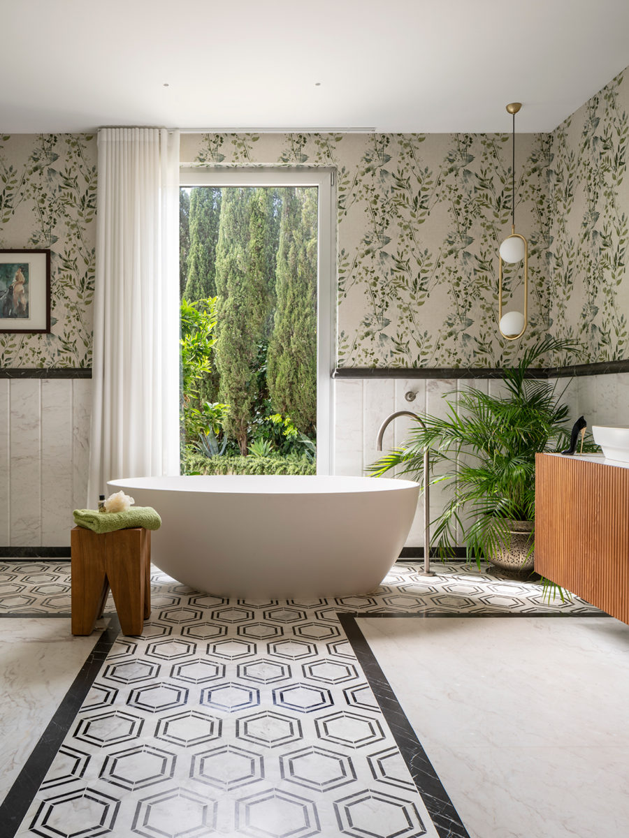 Una vez que Andrea ayudó a Helen a traer todas las piezas interiores que necesitaba, el paso final fue obtener la opinión de la experta en feng shui, Natalie Jürges. Esta parte involucró a Natalie evaluando el flujo de energía en todo el hogar y asegurándose de que Helen tuviera la sensación “acogedora y hogareña” que quería. Para lograr esto, Natalie incorporó más madera en la casa (se dice que representa buena salud y prosperidad) y agregó pinturas y patrones para mayor calidez. Las obras de arte de los artistas locales Joan Ávila y Francesca Martí ayudaron con esto, al igual que agregar papel tapiz de Glamora en la cocina y el dormitorio. “Natalie relajó completamente todo el asunto simplemente haciendo algunos cambios muy pequeños”, dice Helen. Ella presenta algunos ejemplos, que incluyen volver a colocar el televisor, obtener el “azul correcto” en la oficina de Helen y diseñar los pasos hacia la piscina “que se sintió natural”.