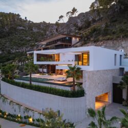 El lenguaje arquitectónico de la villa armoniza con su entorno a través de una planta baja revestida de piedra natural que ancla la casa al terreno de la isla. Por encima, los llamativos volúmenes de estuco blanco con amplios voladizos crean un efecto ligero y escultural. Las generosas aberturas y espacios potencian la luz natural y la circulación del aire, difuminando los límites entre la vida en el interior y el exterior, lo que resulta perfecto para el clima mediterráneo de Mallorca.