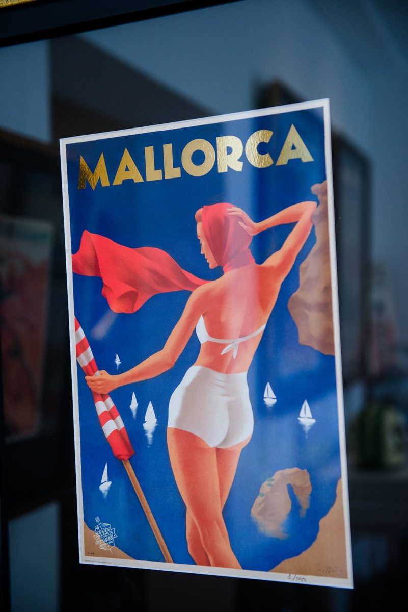 Tras escoger la perfecta ubicación, expusieron los pósteres. En un póster de estilo retro de los años 60 se puede ver a una sofisticada mujer con un vaporoso chal blanco que viaja en el clásico tren de Sóller, que todavía está en funcionamiento. En otra imagen se puede contemplar a una elegante pareja que desciende los escalones que se encuentran frente a la catedral de Palma. El hombre, que va con las mangas de su camisa remangadas debido al calor, rodea con su brazo a la elegante mujer, que lleva un vestido rojo. Hay algo cautivador y fascinante a la vez en estas ilustraciones. Constituyen un retrato mágico del pasado.
