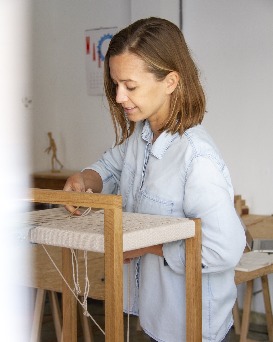 Hoy diseña y fabrica a mano muebles modernos inspirados en estas técnicas vernáculas. Sus piezas emblemáticas son taburetes, bancos y mesillas de noche tejidos con cuerda de algodón reciclado hilado en España, a veces mezclado con cáñamo, y enmarcados en roble local. Cada diseño es intencionado. “La geometría habla”, explica, inspirándose en líneas arquitectónicas, degradados naturales y motivos locales como vallas descoloridas por el sol y celosías de sombra. Cada pieza lleva el nombre de una mujer: abuelas, hijas, amigas… silenciosos homenajes a quienes la han formado.