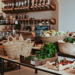 En una pequeña terraza, un par de mesas permiten tomarse un café con bollería vegana. En el interior, se halla una plétora de alimentos, empezando por un colorido puesto de fruta y verdura fresca (toda de cultivo local) y continuando con hileras de frascos de vidrio y dispensadores, con hierbas, especias, frutos secos, semillas, legumbres, pastas, fruta deshidratada, arroz, té, café, vinos, aceites… Hay más de quinientos productos, la mayoría de granjas orgánicas de la isla, aunque el diáfano espacio los presenta holgadamente, mientras que un ambiente tranquilo y acogedor invita a pasearse por la tienda.