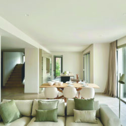 Para resaltar los espacios abiertos y la luz natural de cada habitación, se optó por utilizar muebles de madera de roble natural como base, un detalle que amplía visualmente los espacios y, combinado con los colores neutros que dominan la casa, aporta calidez y continuidad, creando una base estilística atemporal.