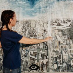 Sally nos cuenta cómo la enorme pintura se adentra en el intrincado laberinto de la existencia y busca alinearse dentro del caos. Retrata la interacción dinámica entre la luz y la sombra, la muerte y el nacimiento, y el “laberinto de la vida” en el que todos vivimos. “Sabía que era un proceso de la vida. Lo he mantenido vivo porque he crecido con la imagen”, explica. “Los altibajos, las entradas y salidas, el cruce de puentes. Pasar del caos y el miedo a la compasión y la alegría, la paz y el crecimiento”.