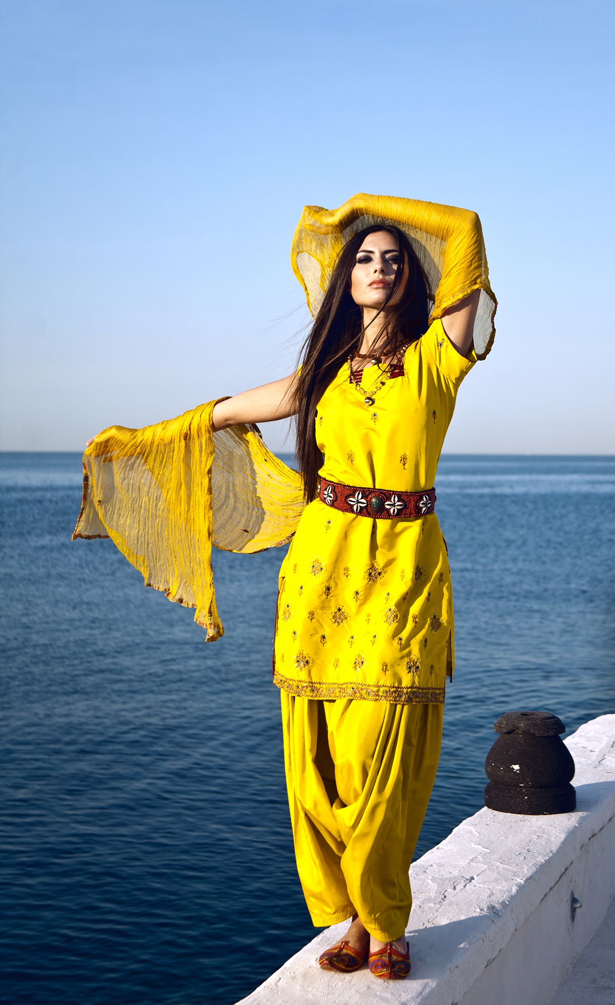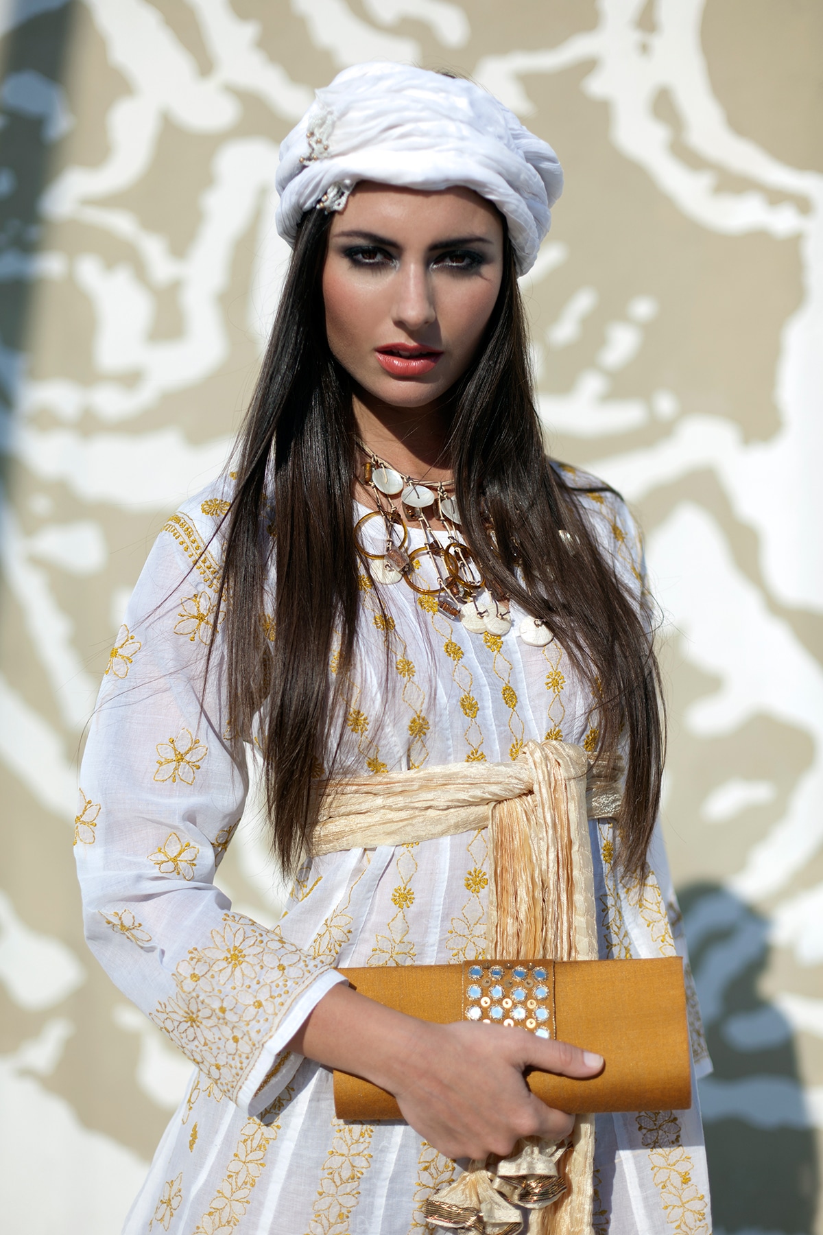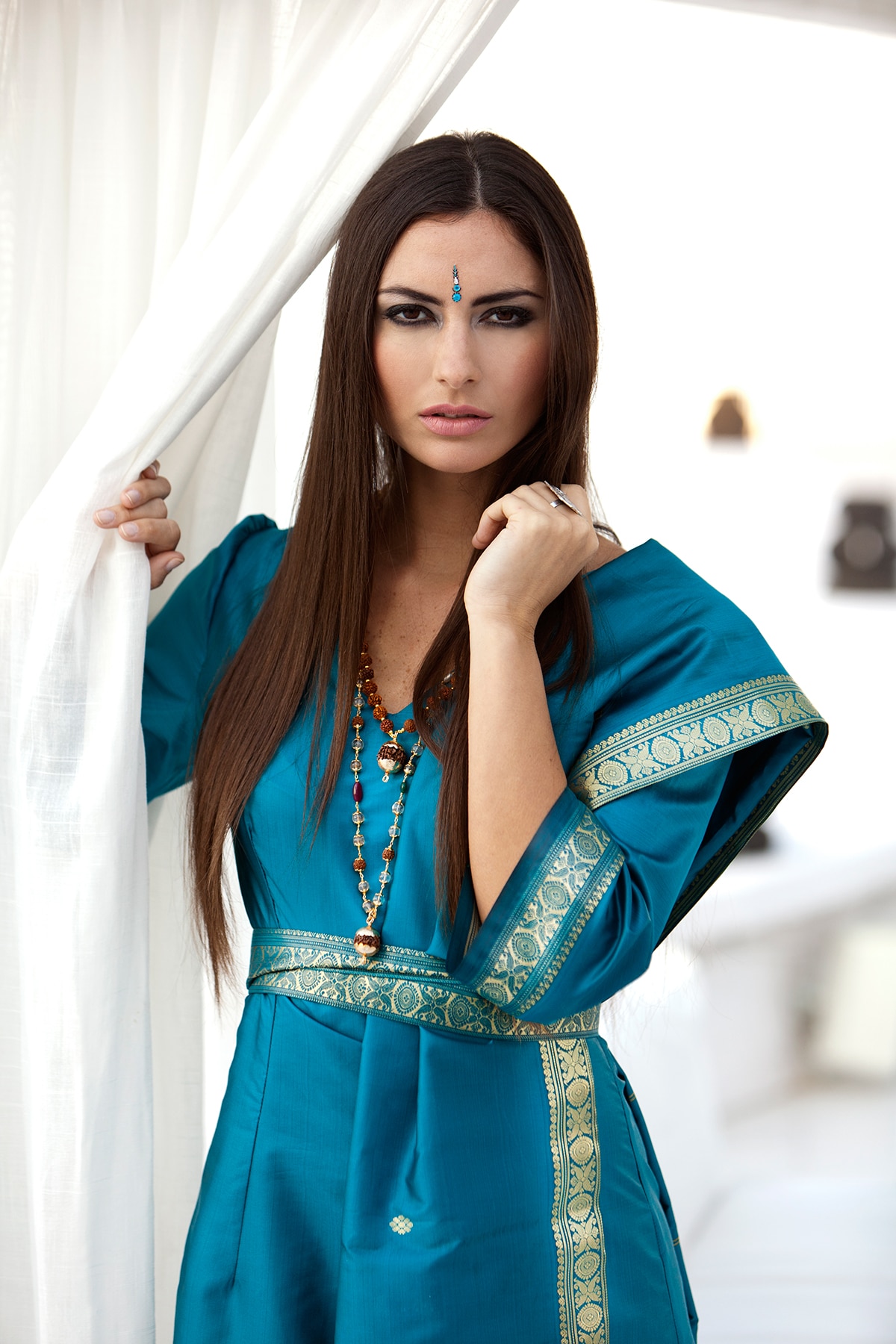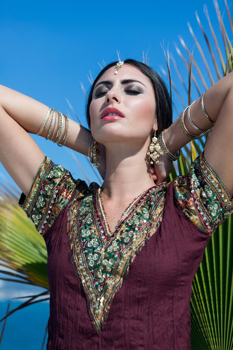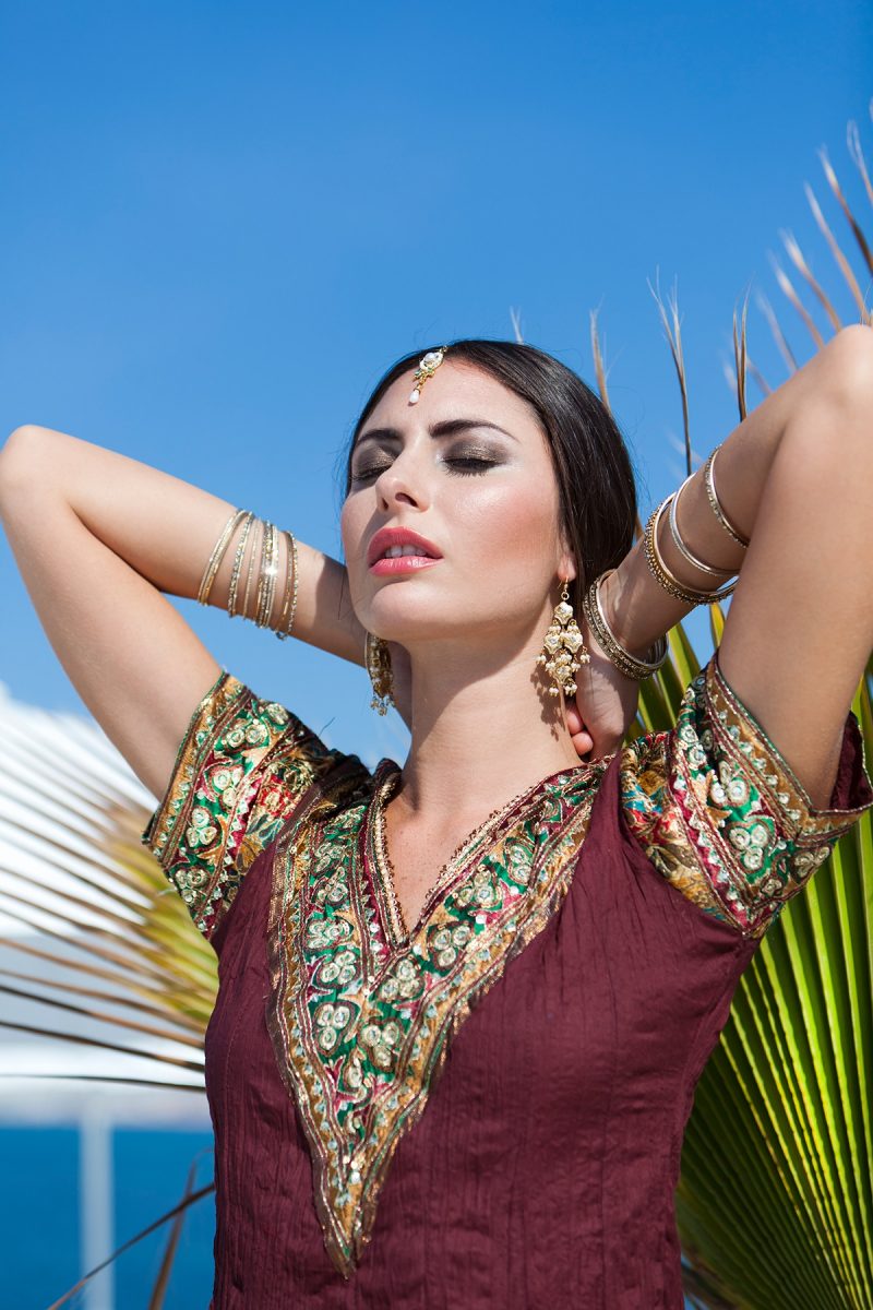 José, al que se puede ver junto con nuestra modelo, no sólo dio a las imágenes una especial autenticidad, sino que también dispone de un stand en el Purobeach Palma vendiendo baratijas estilo indio. Le presentamos una selección de elegantes túnicas decoradas, saris, seductores bikinis, pantalones harem y vestidos. Sedas de colores vívidos adornadas con ricos bordados así como lujosos accesorios y cinturones formaron un estupendo aspecto de la moda india, perfecta para explorar Mallorca con estilo.