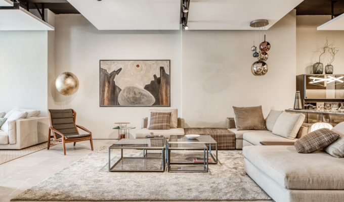 El foco central de esta vivienda se encuentra en una preciosa zona de concepto abierto de salón y comedor. Para el salón, se eligieron varias piezas de la marca italiana Molteni&C, incluyendo el sofá en tono arena y unas mesas de café de cristal, que aportan elegancia y modernidad. La bonita mesa de comedor Riva1920 se acompaña por un juego de sillas de la colección Chelsea de Molteni&C, todo el conjunto está iluminado por la lámpara circular Compendium de la marca Luceplan.