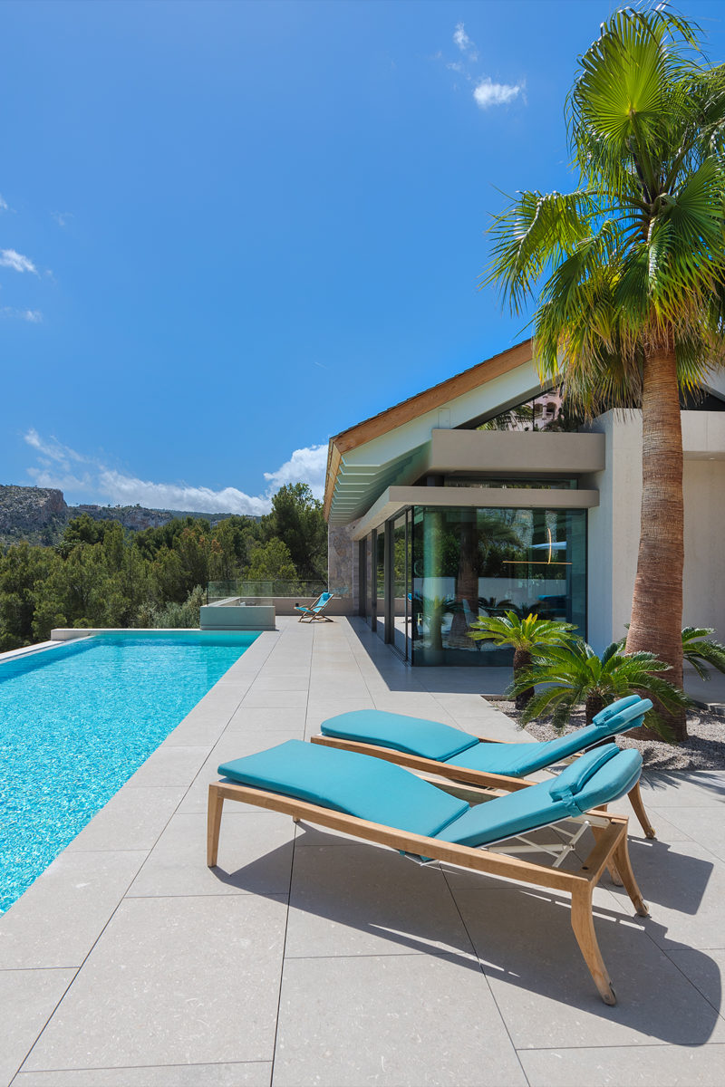 Un amplio salón-comedor y una cocina de estilo americano con puertas correderas de cristal permiten que los espacios se fusionen sin cortes visuales, algo perfecto para disfrutar del famoso estilo de vida mediterráneo al aire libre. La terraza principal tiene una larga piscina infinita y varias zonas chill out.