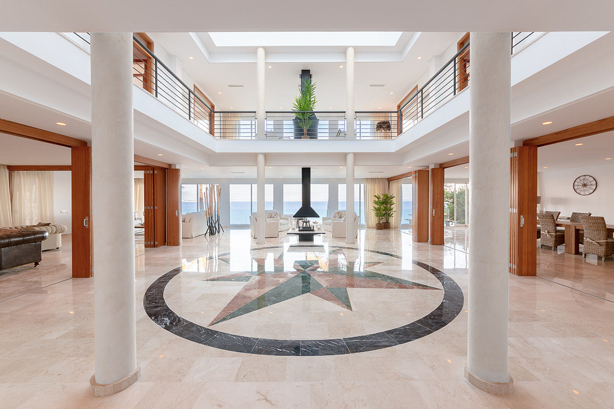 Pero en 2018 la familia decidió que era hora de dar nueva vida al lugar, renovar y reinventar la villa como vivienda de lujo para ser alquilada. Y entonces fue cuando invitaron a Knox Design a participar en el proyecto. Decidieron conservar la mayoría de los elementos de la propiedad, como los elegantes suelos de mármol. Una distintiva rosa de los vientos, visible desde todos los niveles de la casa, se convirtió en el punto de partida para la sutil inspiración marítima del cambio de imagen. El interiorismo y el mobiliario debían funcionar con el diseño existente de la propiedad, que se pensó para simular un crucero, pero con el estilo elegante de un moderno hotel boutique.