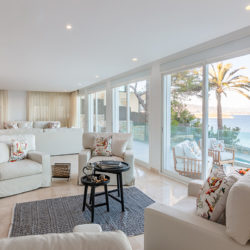 Knox Design evocó el ambiente relajado de Mallorca con lámparas de madera, coloridas telas con estampados de peces y relojes de pared náuticos. Al mismo tiempo, creó un ambiente más contemporáneo con el uso de acentos monocromos y atrevidas rayas. La fachada y la piscina adquirieron nueva vida con la sustitución de las barandillas por paneles de vidrio, para aprovechar al máximo la maravillosa vista. En un divertido ejercicio, la simetría de la propiedad se acentuó al duplicar la apariencia de las habitaciones de cada lado.