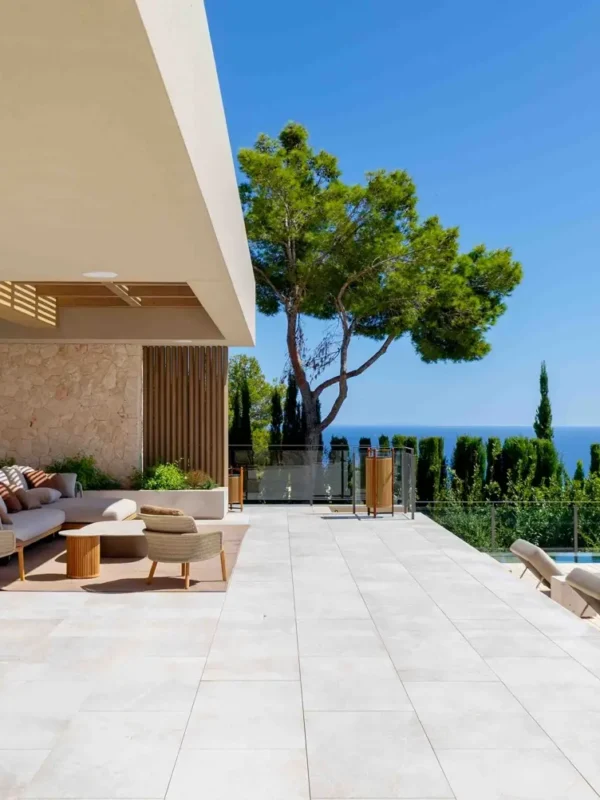 Vivir en una villa con vistas al mar significa empezar el día con luz limpia y terminarlo con horizontes calmados. La orientación sur o suroeste regala sol de invierno a salones y terrazas, prolongando desayunos al aire libre y cenas sin prisa. Acristalamiento sombreado, porches proporcionados y pavimentos continuos interior-exterior permiten que la casa “respire”, uniendo cocina, salón y piscina como un único escenario de vida.