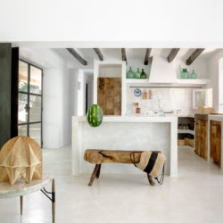 El sabor de la Mallorca más tradicional queda patente en las antiguas vigas de madera, las cestas de mimbre, el banco de nudosa madera de la cocina así como en los característicos azulejos junto a la chimenea. Estos detalles rústicos se combinan con la moderna tendencia que aboga por dejar los elementos estructurales a la vista o por insertar finos marcos de metal en las puertas.